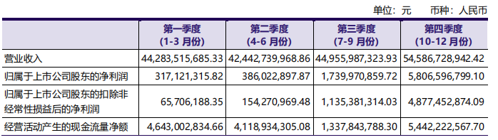 年報數(shù)據(jù)顯示,2023年,公司實現(xiàn)營業(yè)收入1862.69億元,同比增長7.68%;實現(xiàn)歸屬于母公司凈利潤82.50億元,同比增長36%,雙雙創(chuàng)下歷史新高。其中,第四季度實現(xiàn)盈利58.07億元,同比增長257.89%,創(chuàng)下有史以來單季度盈利新高。