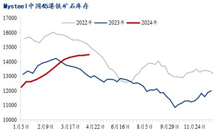 港口庫(kù)存方面,4月15日,中國(guó)45港進(jìn)口鐵礦石庫(kù)存總量14656.54萬(wàn)噸,環(huán)比上周一增加190萬(wàn)噸,47港庫(kù)存總量15296.54萬(wàn)噸,環(huán)比增加245萬(wàn)噸。目前累庫(kù)有所放緩,五一節(jié)前鋼廠補(bǔ)庫(kù)力度,廠內(nèi)庫(kù)存或小幅增加,后續(xù)在疏港增加之下,港口庫(kù)存或逐步迎來(lái)庫(kù)存拐點(diǎn),但4月份仍難降庫(kù)。
